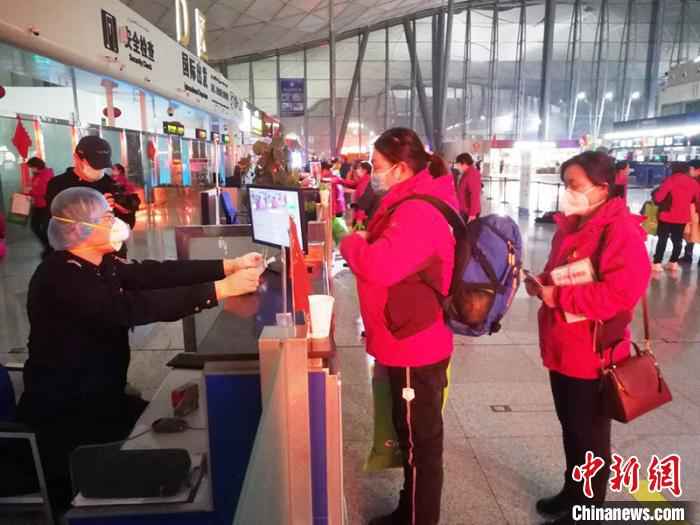 新疆第二批援鄂医疗队队员开始安检,进入候机厅。 王小军 摄